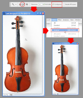 Make a selection around the violin image. The Easiest way to do this step is by using the Magic Wand tool ( see settings below, make sure you activate the add to Selection button (circled on left) and check the (Contiguous option). Click several times to select all of the background area, which is colored white. Then Inverse the selection (just press Ctrl+Shift+I) and then paste ( Ctr+V ) it to the document we created before.